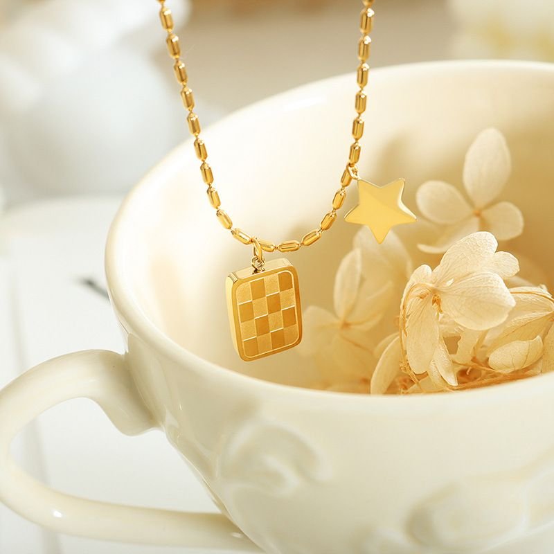 Titanium Steel Fashion Retro Chessboard Square Star Pendant Necklace